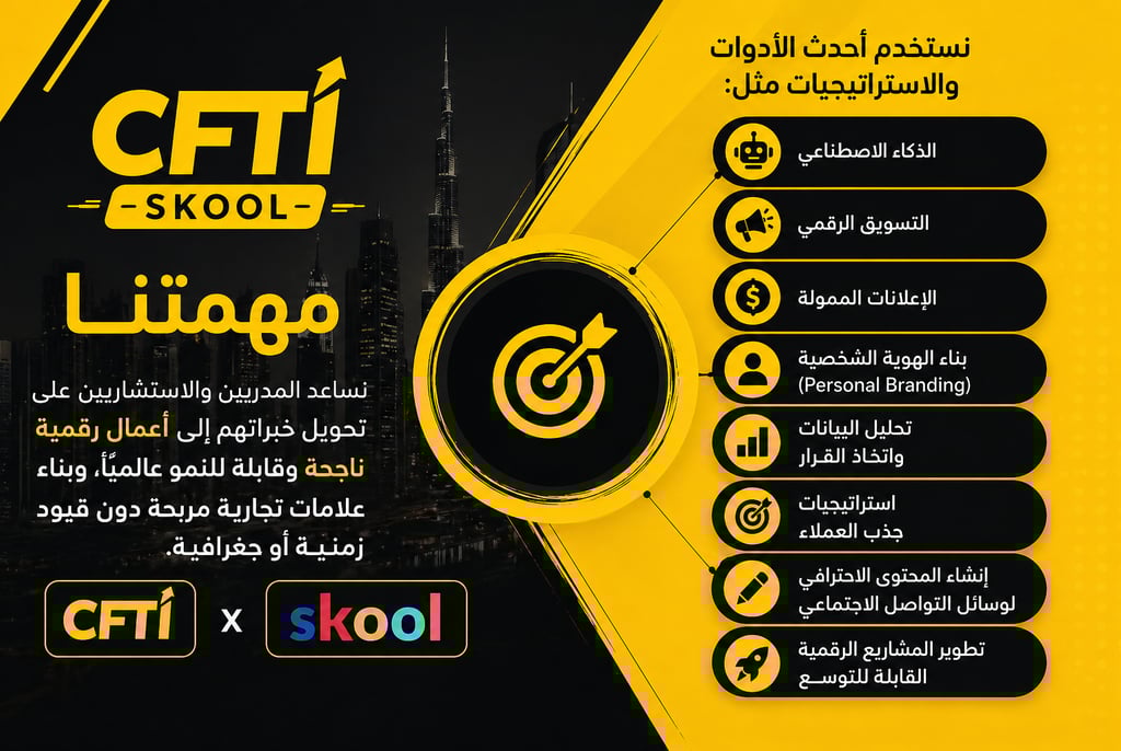 في CFTI SKOOL ، نمكّن الخبراء من التحرر من القيود المحلية وبناء أعمال رقمية مزدهرة عبر الإنترنت.
